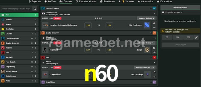 O n60 oferece uma grande seleção de opções de apostas em e-sports com probabilidades competitivas